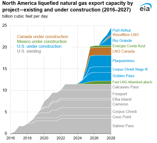 وكان ملفتاً التزايد في مشروعات تسييل الغاز وتغويزه على ضفتي الأطلسي. إذ تأتي مرة ثانية «أرقام» إدارة معلومات الطاقة «أصدق» من الخطابات. فتذكر ان القدرة التصديرية للغاز الطبيعي المسال في أميركا الشمالية سترتفع من حوالي 11.4 مليار قدم مكعب يومياً إلى 24.3 مليار ق/م ي/ بحلول العام 2027.