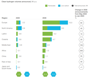 وكان تقرير تدفقات الهيدروجين العالمية، الذي أصدره مجلس الهيدروجين بمشاركة شركة ماكينزي آند كومباني. قد ذكر أن قيمة الاستثمارات في المشاريع المسجلة أو المعلنة بلغت قيمتها حتى أكتوبر 2023 حوالي 570 مليار دولار. وبقدرة انتاجية لهذه المشاريع تفوق 45 مليون طن سنوياً. والملفت أن أوروبا سجلت النسبة الأدنى في عدد المشاريع المنفذة إلى المشاريع المعلنة، إذ بلغت 3 في المئة. مقابل 15 في المئة في أميركا و 35 في المئة في الصين.